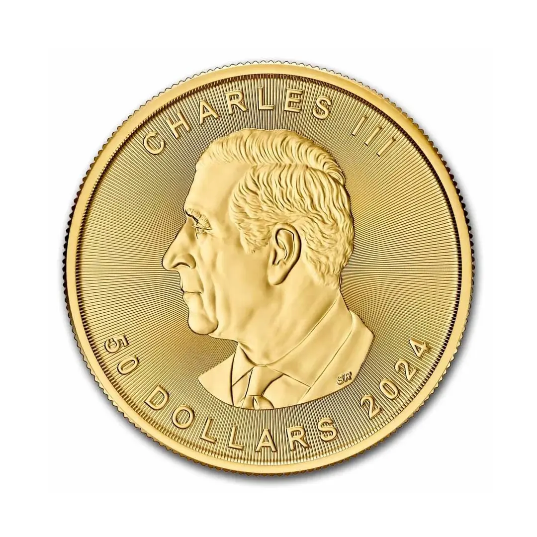 In 2024, we embrace a new era as the elegant Canadian Maple Leaf, containing 1 oz of .9999 fine gold, showcases the new effigy of His Majesty King Charles III.
