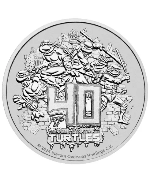 40th anniversary design: The coin showcases the Teenage Mutant Ninja Turtles breaking through a brick wall with urban skyscrapers in the background. It features the official "40 YEARS OF TEENAGE MUTANT NINJA TURTLES" anniversary logo and The Perth Mint's distinctive "P" mintmark.