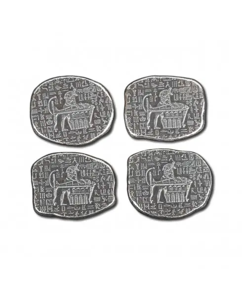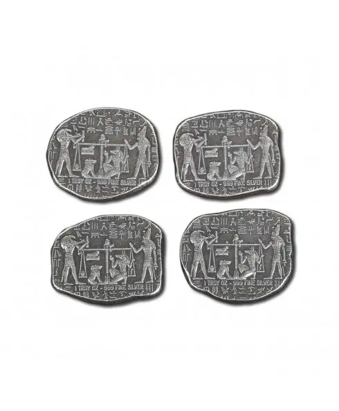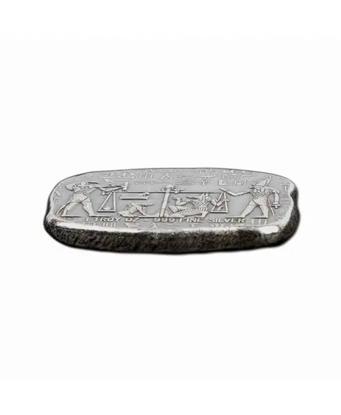 1 troy oz fine silver bar. These are new bars which were purposely made to look like ancient stone relics chipped off the side of a tomb. No two bars are exactly alike as they have been purposely hand struck off center and given an application of "antique" patina along with an "anti-polish" to add to the look of old world charm.