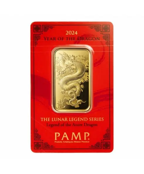 Discover The Bullion People's 1 oz Gold PAMP Lunar Legends Azure Dragon Bar 2024 (In Assay). This intricately designed bullion bar unfolds the legend of the Azure Dragon, the guardian of the east in the Chinese lunar calendar.