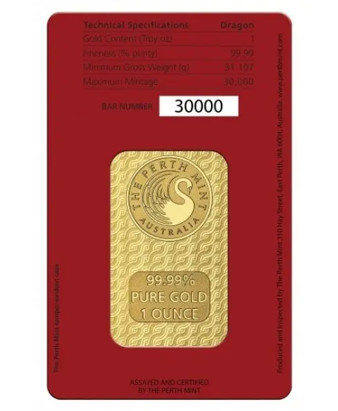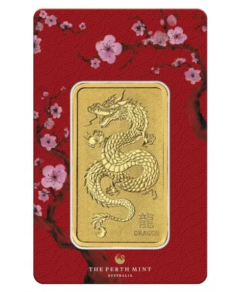 This intricately designed gold bar is meticulously crafted, featuring a minted portrayal of a lunar dragon against a textured background. The sinuous, finely detailed creature is depicted reaching for a blazing pearl, symbolizing wisdom. Additionally, the design includes the word 'DRAGON' and the corresponding Chinese character. On the reverse side of the bar, The Perth Mint's London Bullion Market Association registered mark, representing the institution's 125-year heritage of excellence, is stamped alongside the logo and specifications of the bar's weight and purity, all against the same textured backdrop.